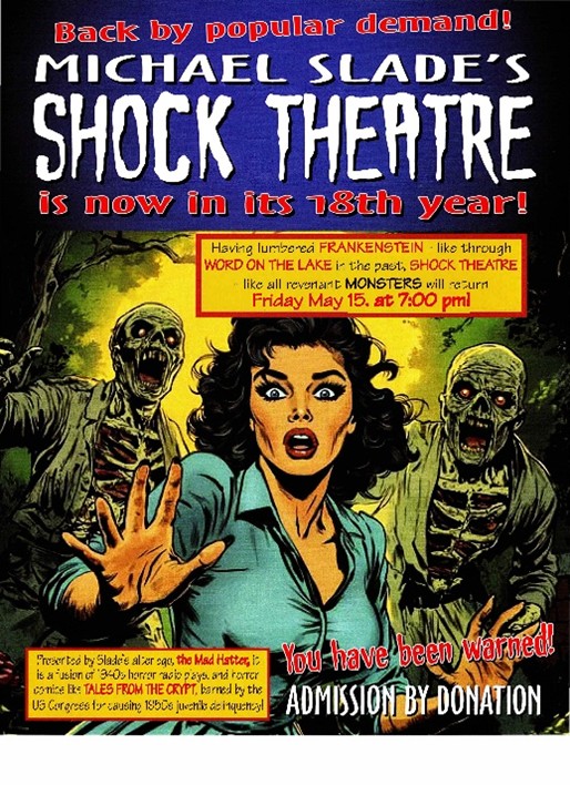 SHOCK THEATRE! Written by the Mad Hatter (aka Michael Slade) a cast as you have never seen them before – Grant Lawrence, Jill Barber, Iona Whishaw, Andrew Buckley, Finnian Burnett, Gail Anderson-Dargatz.